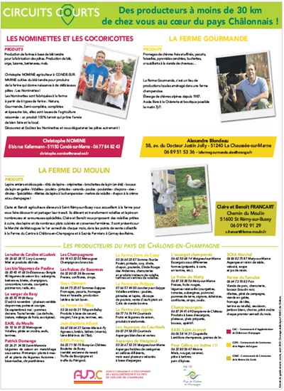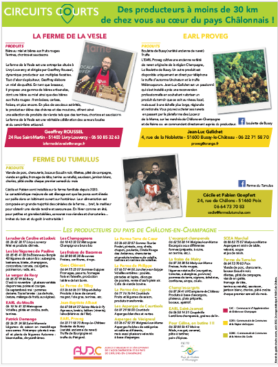 Dans le cadre de l’axe 4 de la stratégie du PAT « Valoriser les actions agricoles et alimentaires », notamment en rendant plus lisible l’offre en produits locaux, le PETR du Pays de Chalons à ce titre a engagé une action de promotion et de communication sur les producteurs locaux du territoire en réalisant une plaquette 2024 des producteurs existants sur son territoire.