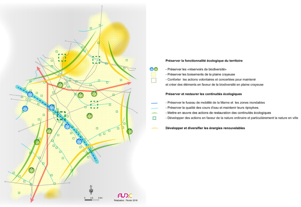 La préservation des coupures agricoles/naturelles entre les communes de la vallée de la Marne, qui est un acquis de plus de 40 ans de planification supracommunale, est un bon exemple de mesure utile à la fois à la gestion du risque d’inondation, à la préservation des espaces agricoles de proximité tout comme de l’identité des communes et des paysages. - L’ambition environnementale du SCoT prend bien sûr en compte la diminution des pressions et pollutions sur l’eau, l’air, et les ressources du sous-sol. Le ménagement des ressources doit également reposer sur une gestion durable des déchets et le développement de l’économie circulaire.
