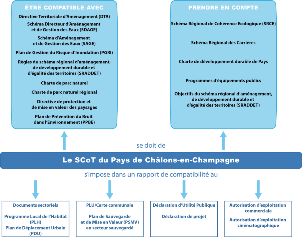 Ainsi, le socle législatif et réglementaire déterminé par l’Etat s’impose au SCoT avec notamment les principes généraux de l’urbanisme et, lorsqu’elles existent, les Directives Territoriales d’Aménagement. Les SCoT doivent également prendre en compte les programmes d’équipement de l’Etat, des collectivités locales et des services publics. Ils doivent être compatibles notamment avec les chartes des parcs naturels régionaux, avec les orientations fondamentales et les objectifs de qualité et de quantité des schémas directeurs d’aménagement et de gestion des eaux (SDAGE), les objectifs de gestion des risques d’inondation et les orientations fondamentales définis par les plans de gestion des risques d’inondation (PGRI) et les règles générales du fascicule du schéma régional d’aménagement, de développement durable et d’égalité des territoires (SRADDET).